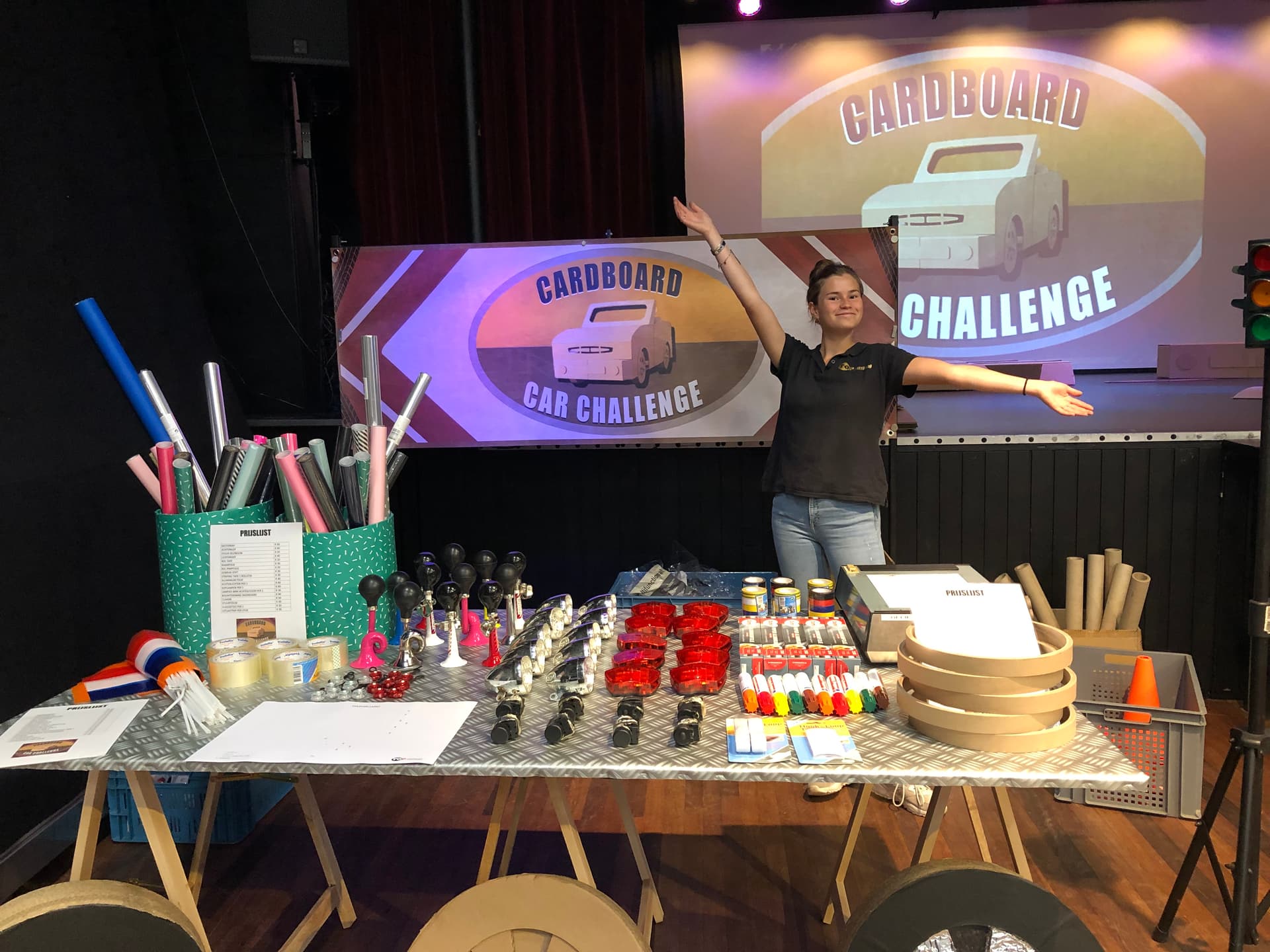 Bij aankomst is er enkel een stapel (gerecycled) karton zichtbaar. Zodra het startsein is gegeven, vouwt, snijdt en bouwt ieder  team er op los. Begonnen wordt met het chassis welke volgens een bouwschema gebouwd wordt,  zodat deze minimaal 2 personen kan dragen. Daarna gaat het creatief proces pas echt van start. Wordt het een snelle raceauto of toch dat volkswagenbusje of lelijke eendje? Alles is mogelijk en in de winkel zijn alle benodigdheden te vinden om jullie auto geheel naar wens te pimpen. De tijd zal voorbij vliegen en voor jullie het weten is het tijd voor de race. Al jullie creaties worden met piepende banden over een parcours gereden. Houdt jullie auto stand? Het winnende team zal uiteraard met een originele prijs worden beloond!