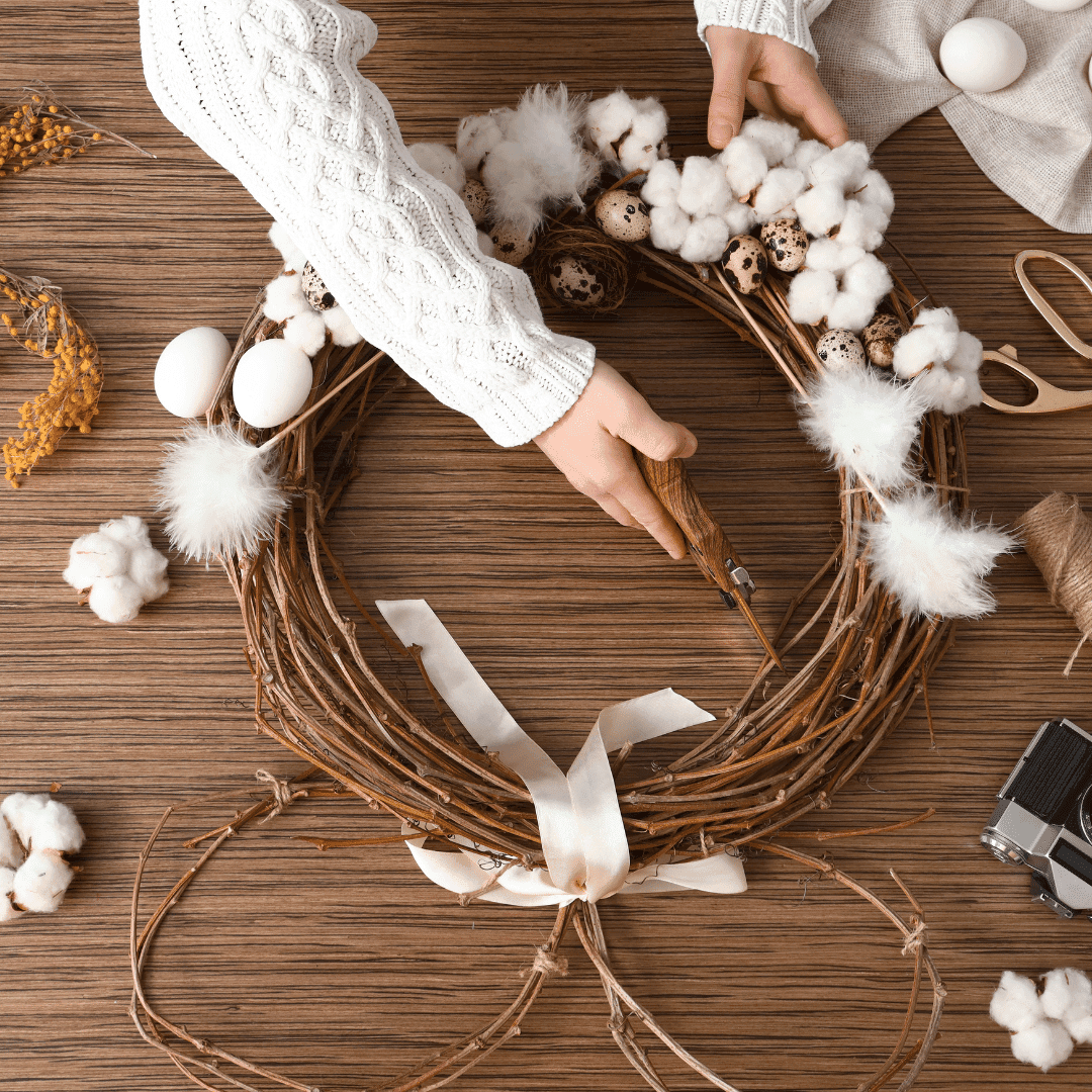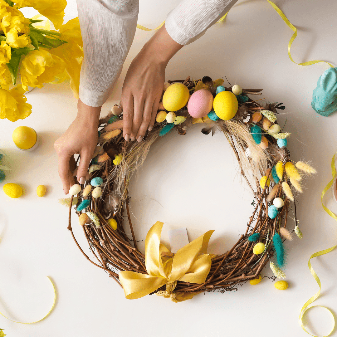 Tijdens de workshop paaskans maken, werken we met een krans van stro. Deze ga je versieren met bolletjes, eieren, lint, ornamenten en natuurlijk groen! Deze zitten inbegrepen bij de workshop. Je gaat aan de slag met het maken van een paaskrans die naar jouw wens is. Mocht je zelf nog specifieke wensen hebben of nog mooi lint hebben liggen, neem dit dan vooral mee! Er is een boel mogelijk. We kunnen ook werken met bepaalde kleuren die passen bij jouw organisatie bijvoorbeeld.
