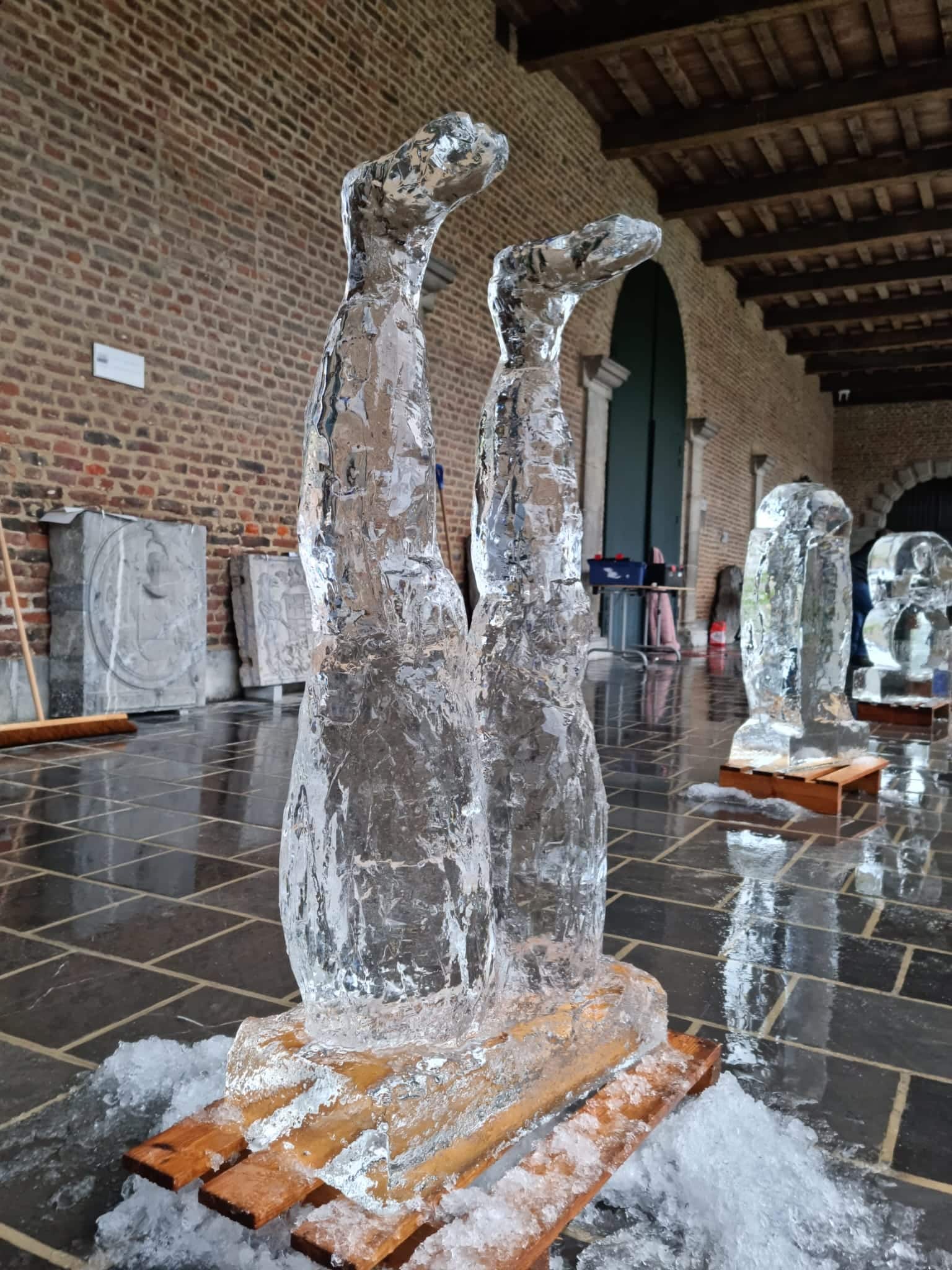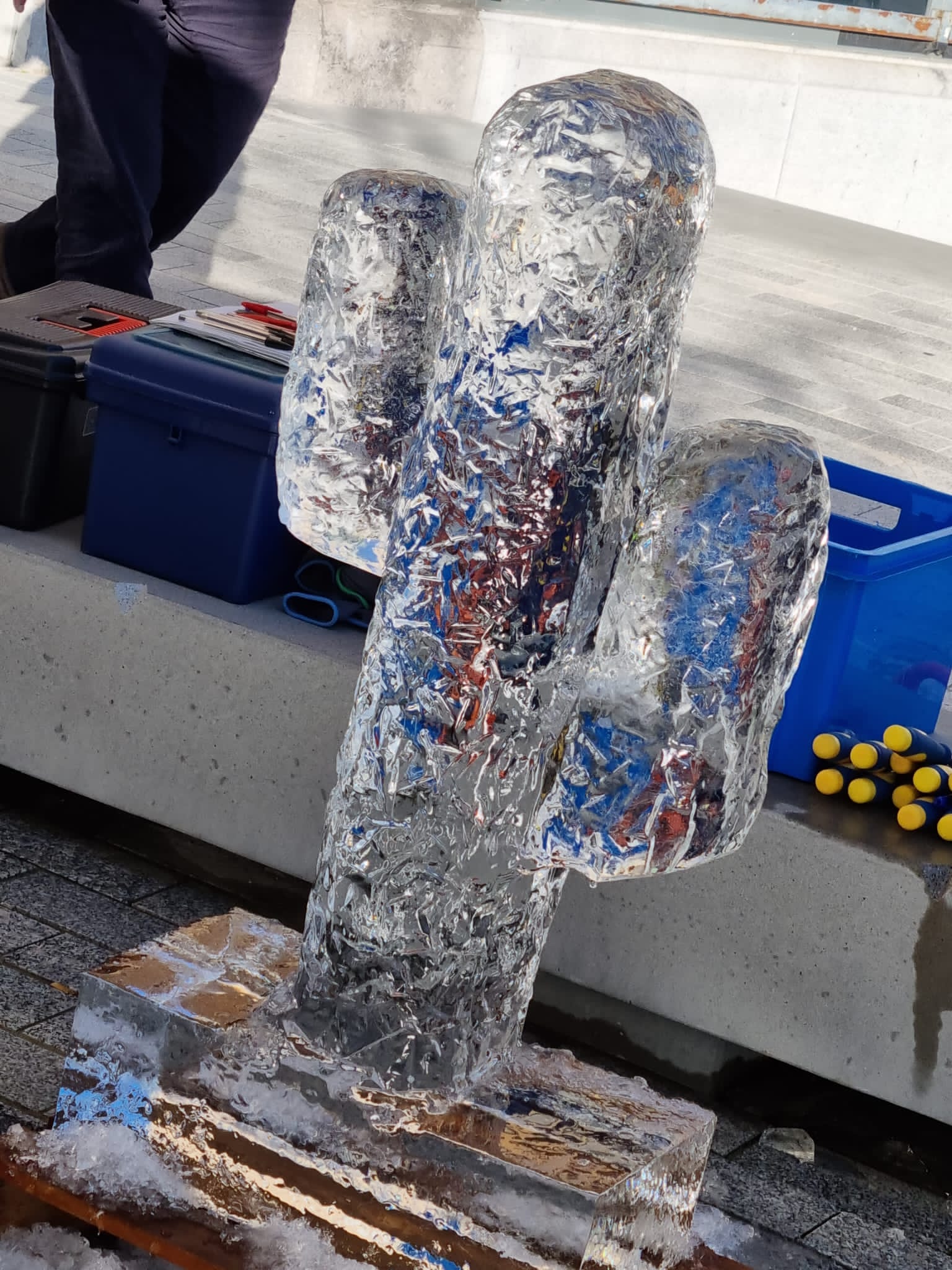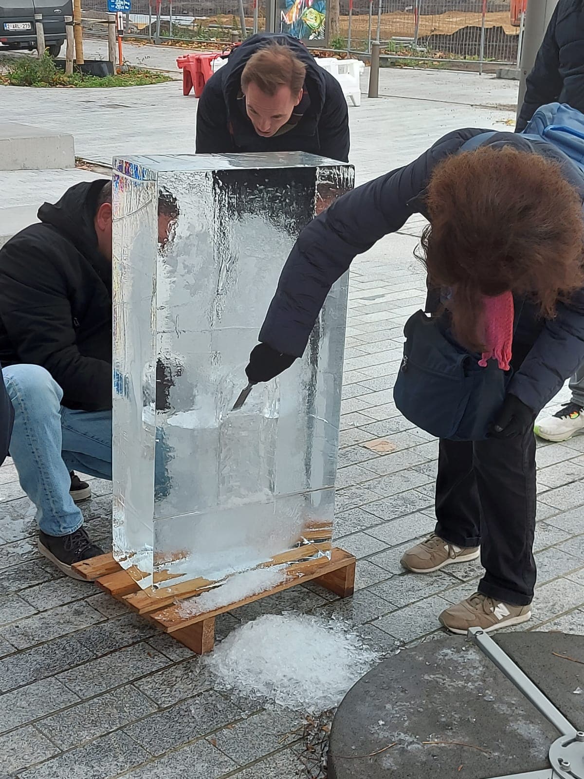 We divide the group into teams and each team works together on a solid ice block of 120 kg (100x50x25 cm).