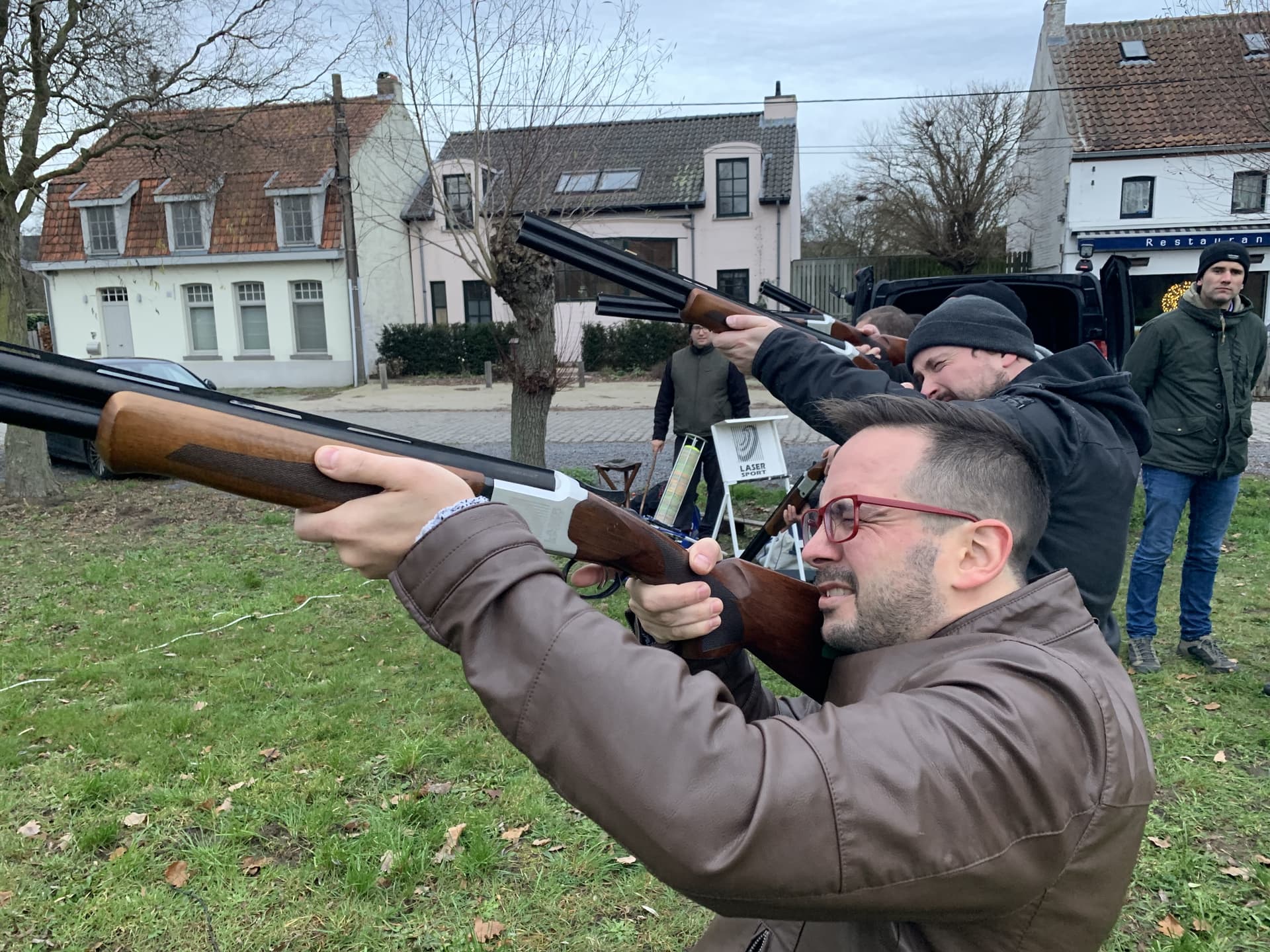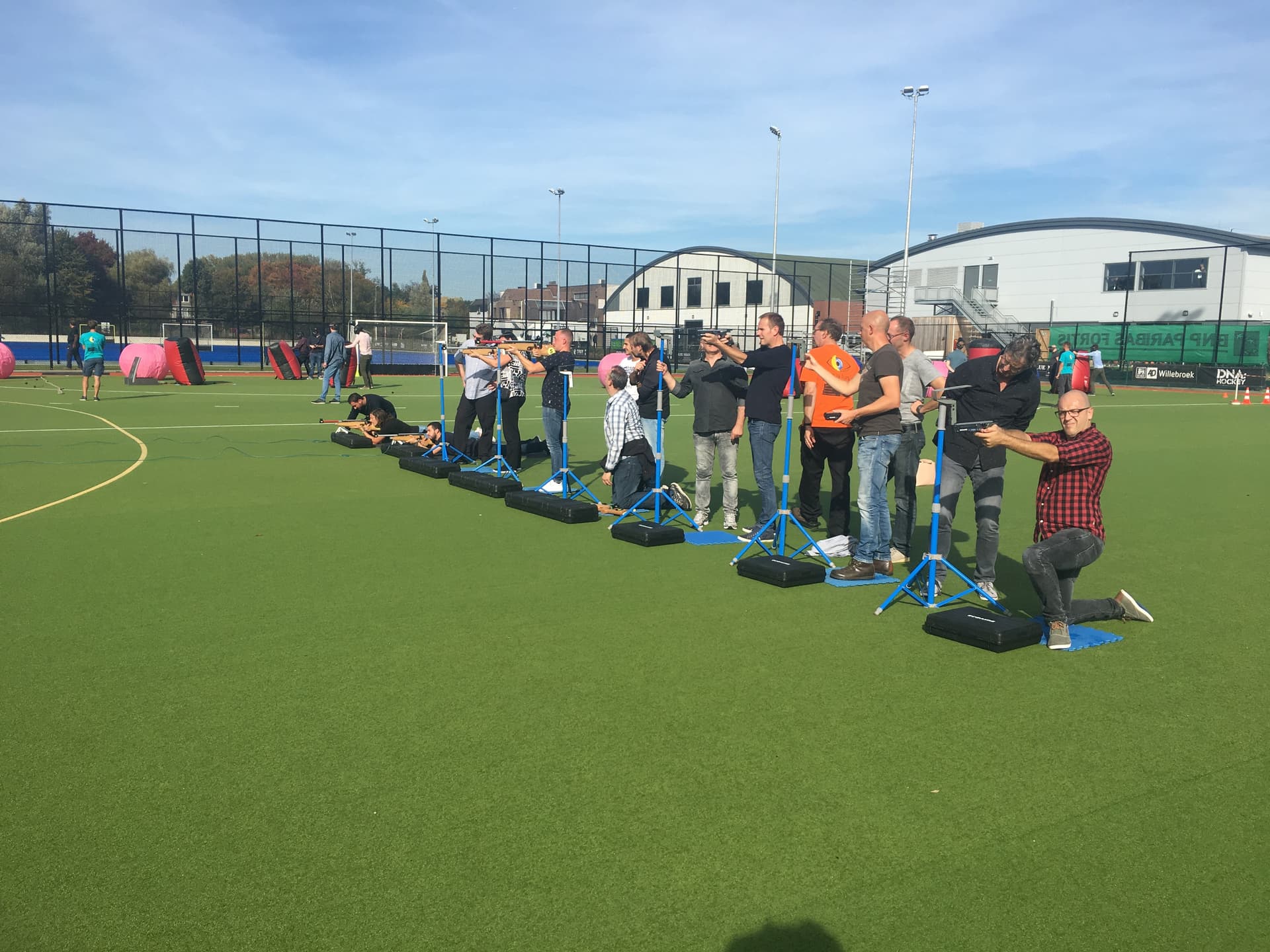Laser clay pigeon shooting: 50m by 30m open terrain (no trees), with a minimum of 10 m² soft ground for landing the clays (meadow, football field, etc.) per system.