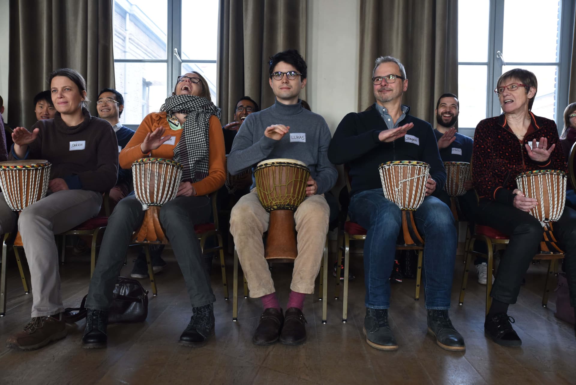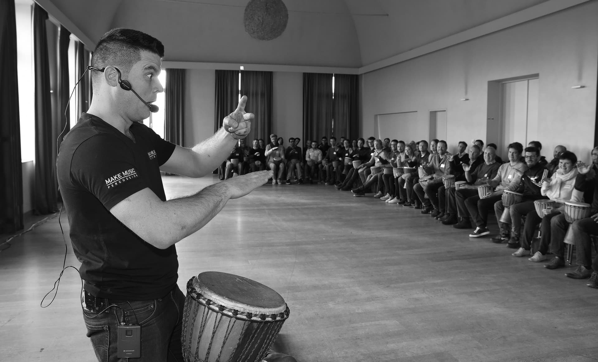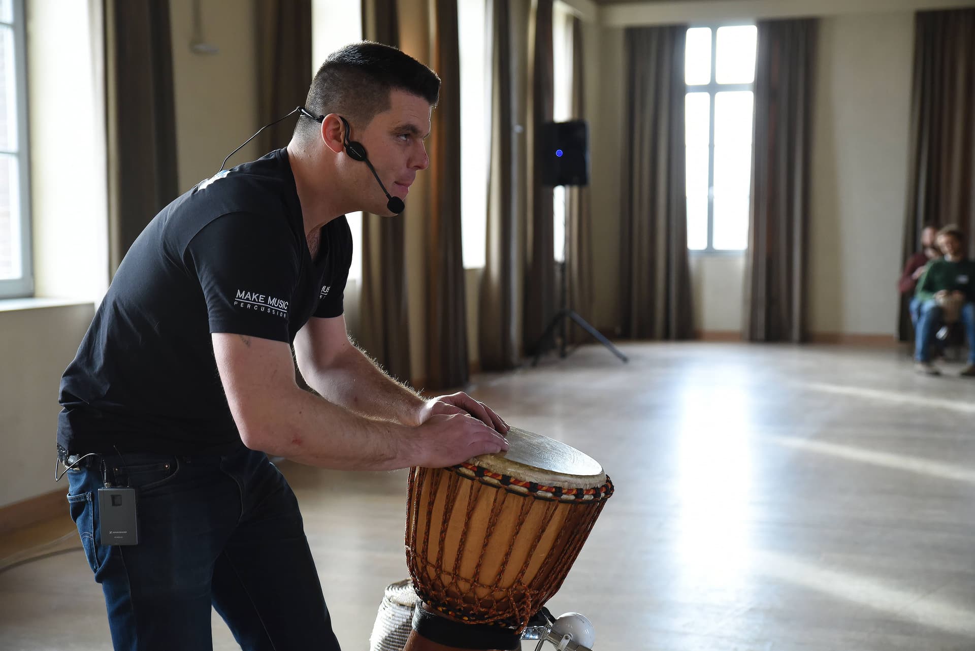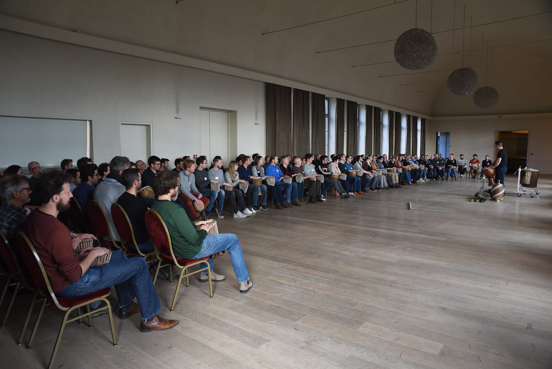 De percussie workshop is een unieke ervaring, waarbij op verrassende wijze het beste naar boven gehaald wordt uit iedere individuele deelnemer én uit het hele team! Tijdens een interactief ludiek spektakel met percussie als basiselement worden de deelnemers meegenomen op een ritmische wereldreis. Het team van begeleiders zorgt samen met de deelnemers voor een heerlijk ontspannen sfeer, met na afloop van het evenement niets dan laaiend enthousiaste, blije en ontspannen gezichten.
