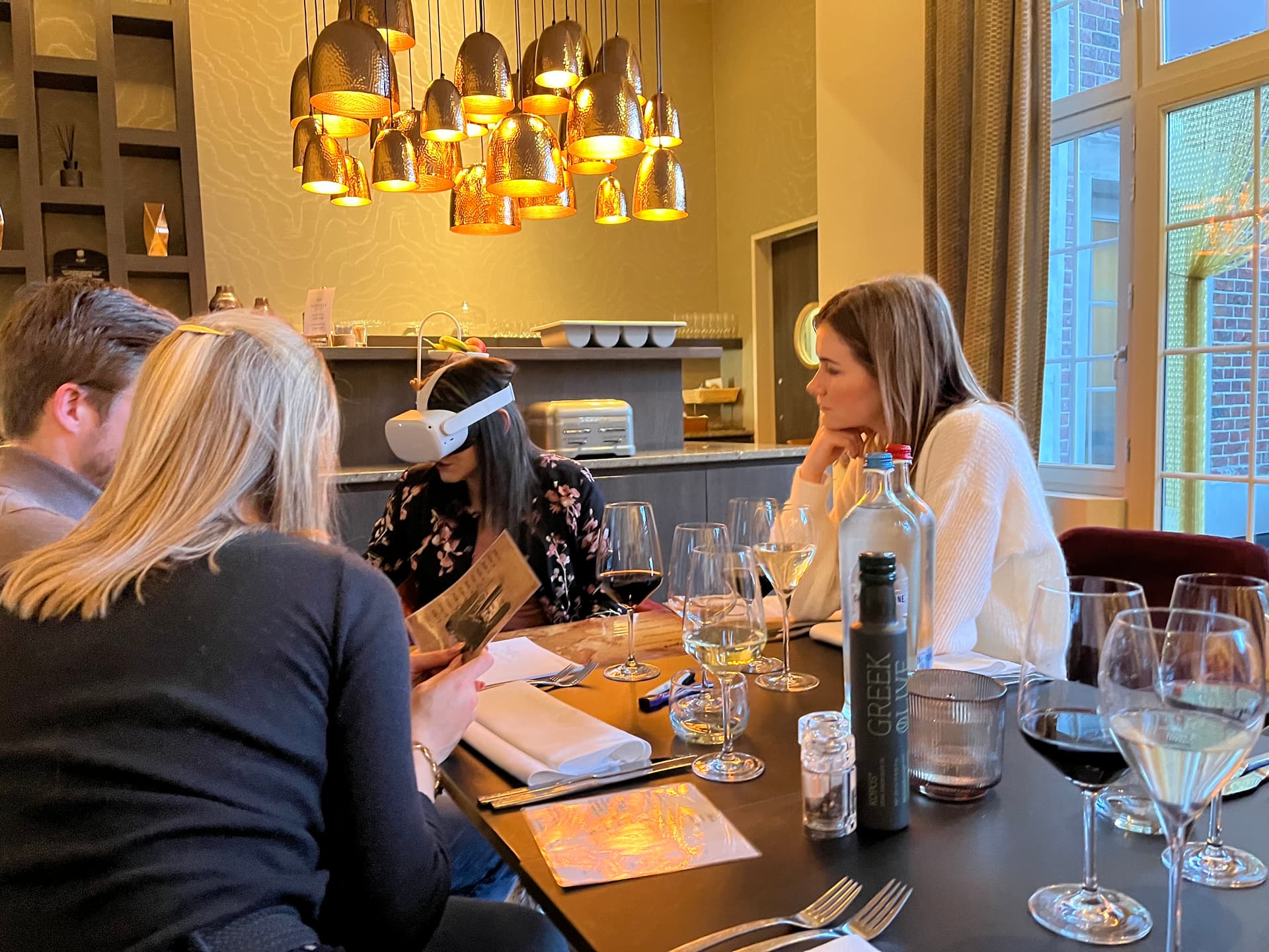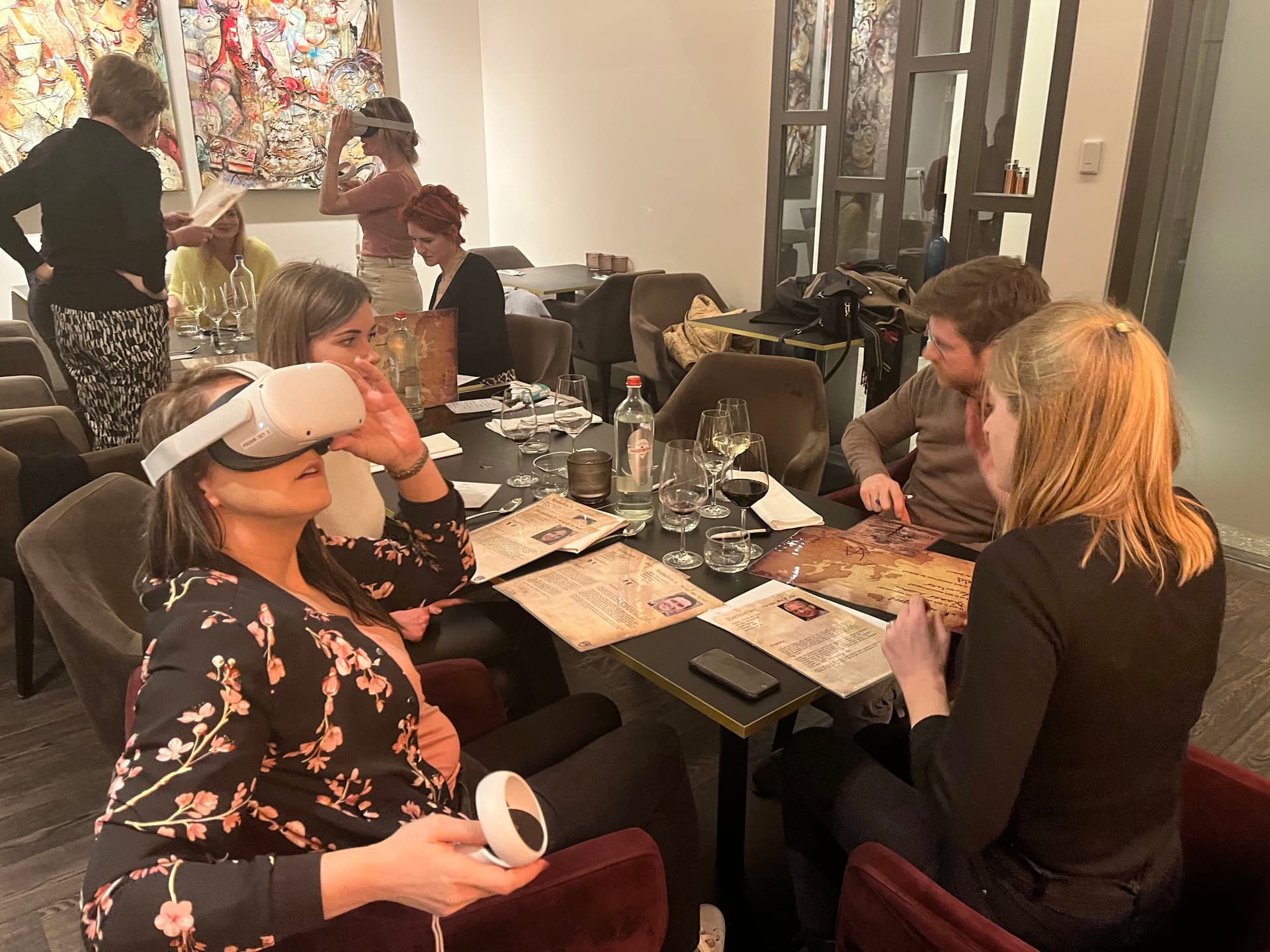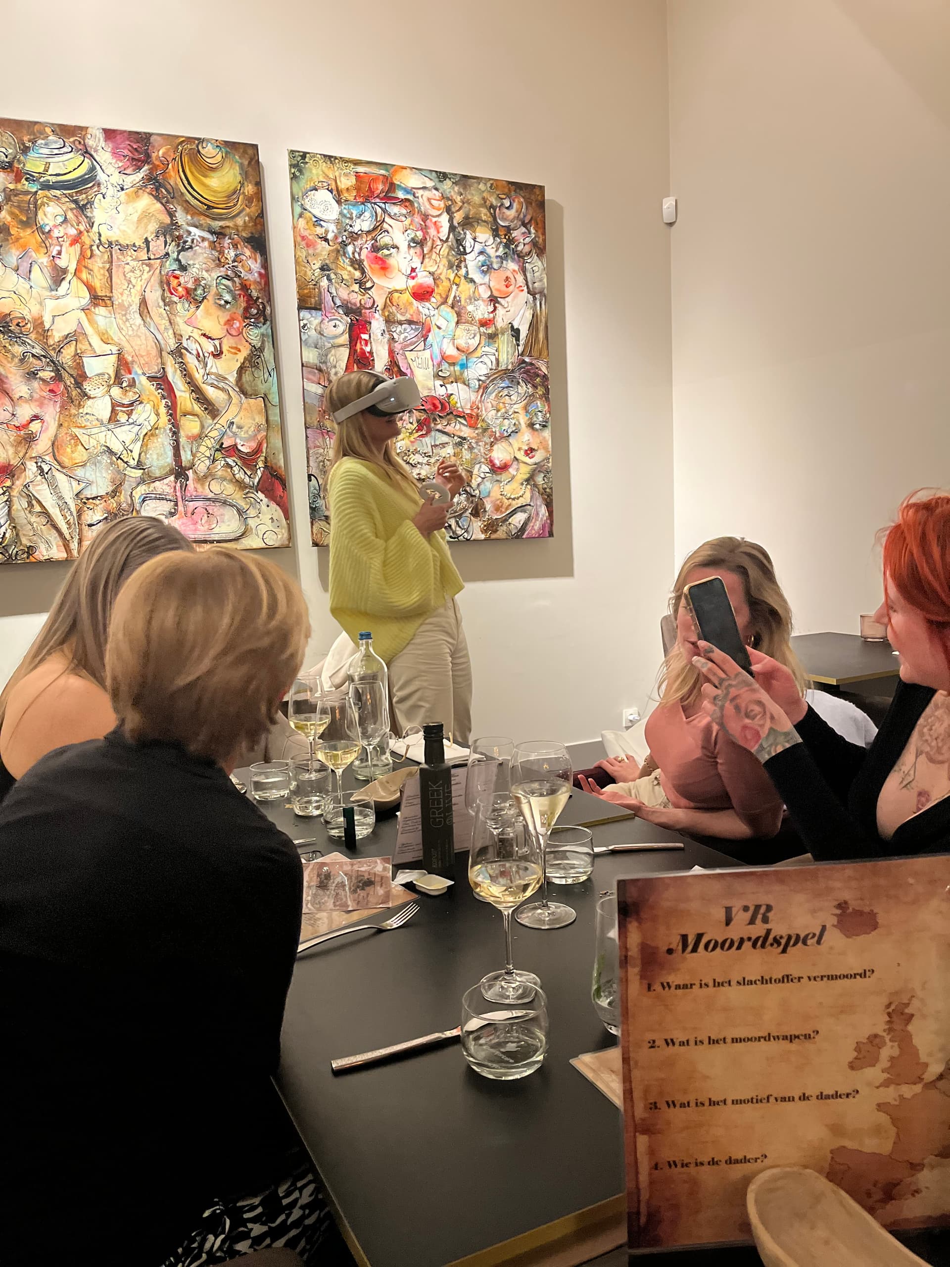 VR Murder Hotel is a virtual reality version of the ‘real-life’ murder mystery game. The goal remains the same: track down the killer as quickly as possible and eliminate suspects! You play the game with your team of four to five people during a multi-course dinner or lunch. Between each course, you continue your investigation into the murder of the hotel owner. Take a seat at the table!