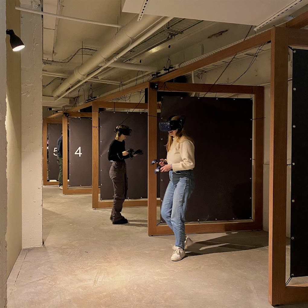 Elke VR booths beschikt uiteraard over een eigen VR-bril. Belangrijk om op te merken is dat deze VR-bril met een kabel vast hangt aan krachtige PC, waardoor de bewegingsruimte iets beperkter is. Je kunt absoluut vrij rondbewegen binnen de booth, maar in de betreffende games wordt voornamelijk gebruik gemaakt van teleportatie door middel van een knop op jouw controllers. Zo kunnen de grote omgevingen binnen de games toch vlot worden verkend. Het voordeel hierbij is dat de werelden veel groter zijn zonder veel laadtijden. Hier kunnen 6 personen tegelijk spelen.