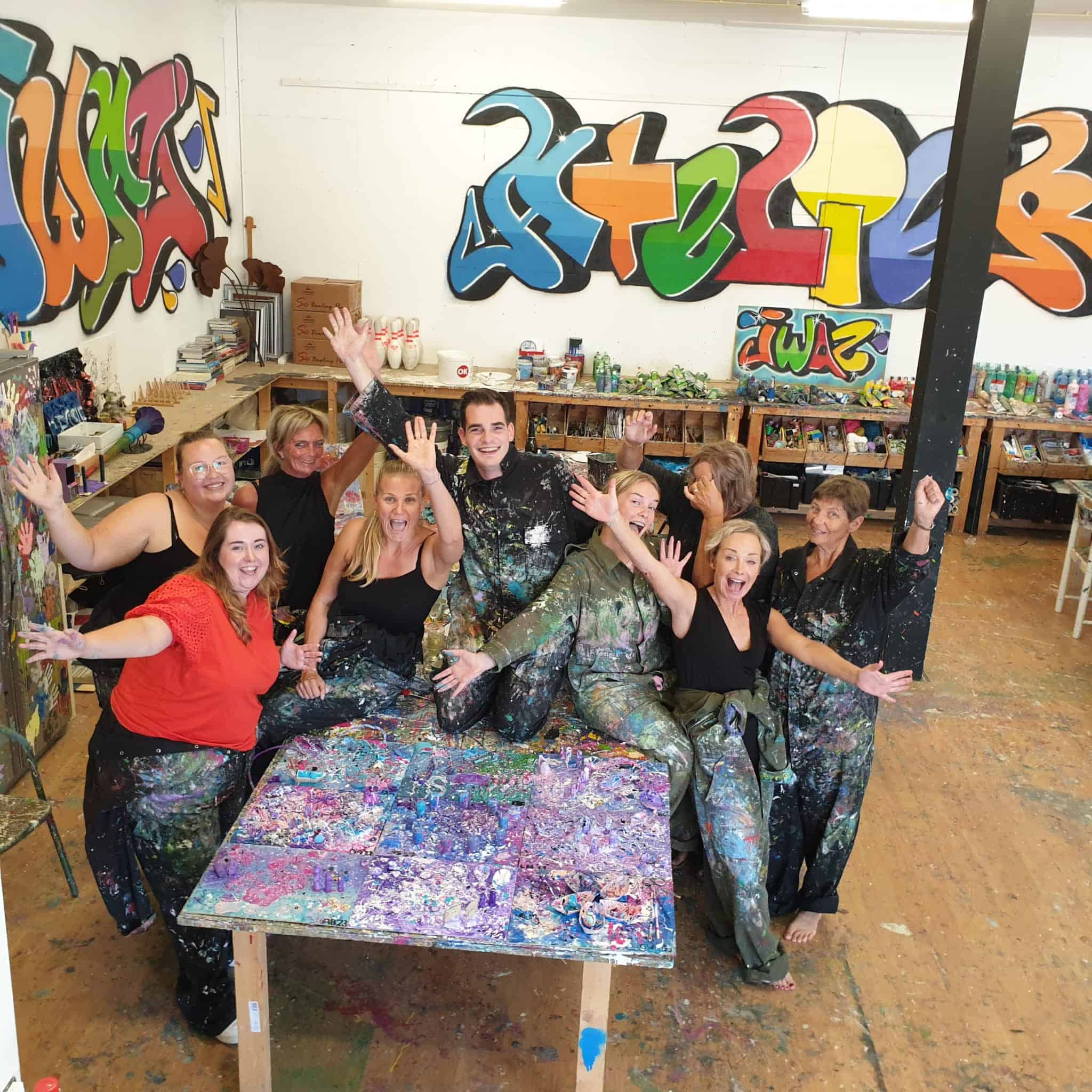 Ons spetterende atelier en onze kleurrijke galerie bevinden zich in Bergen op Zoom. U bent van harte welkom om deze creatieve wereld te komen ontdekken. Ook geven wij workshops op locatie. Dit doen wij vanaf groepen vanaf 20 personen, op uw locatie.