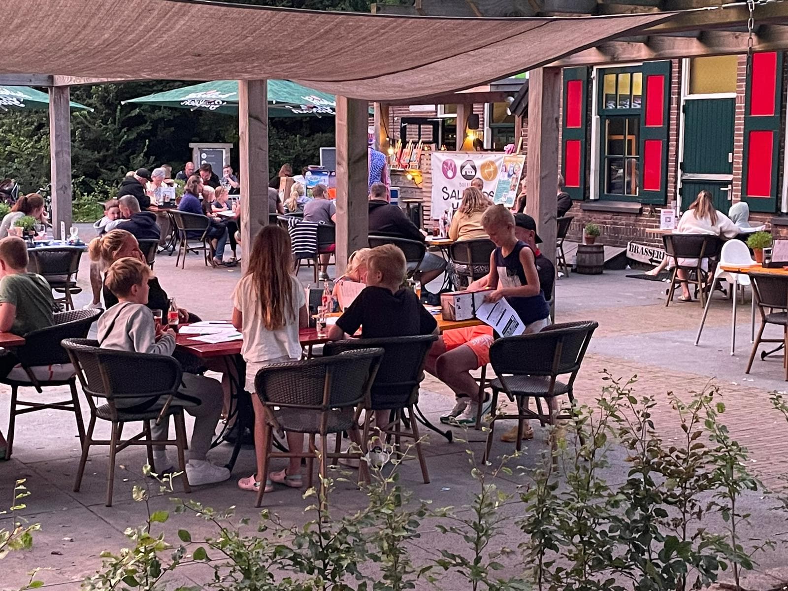 Huzarensalade, amerikaanse coleslaw, courgette, paprika, champignons, uienringen, aardappelwedges, vers afgebakken stokbrood, kruidenboter en diverse sauzen