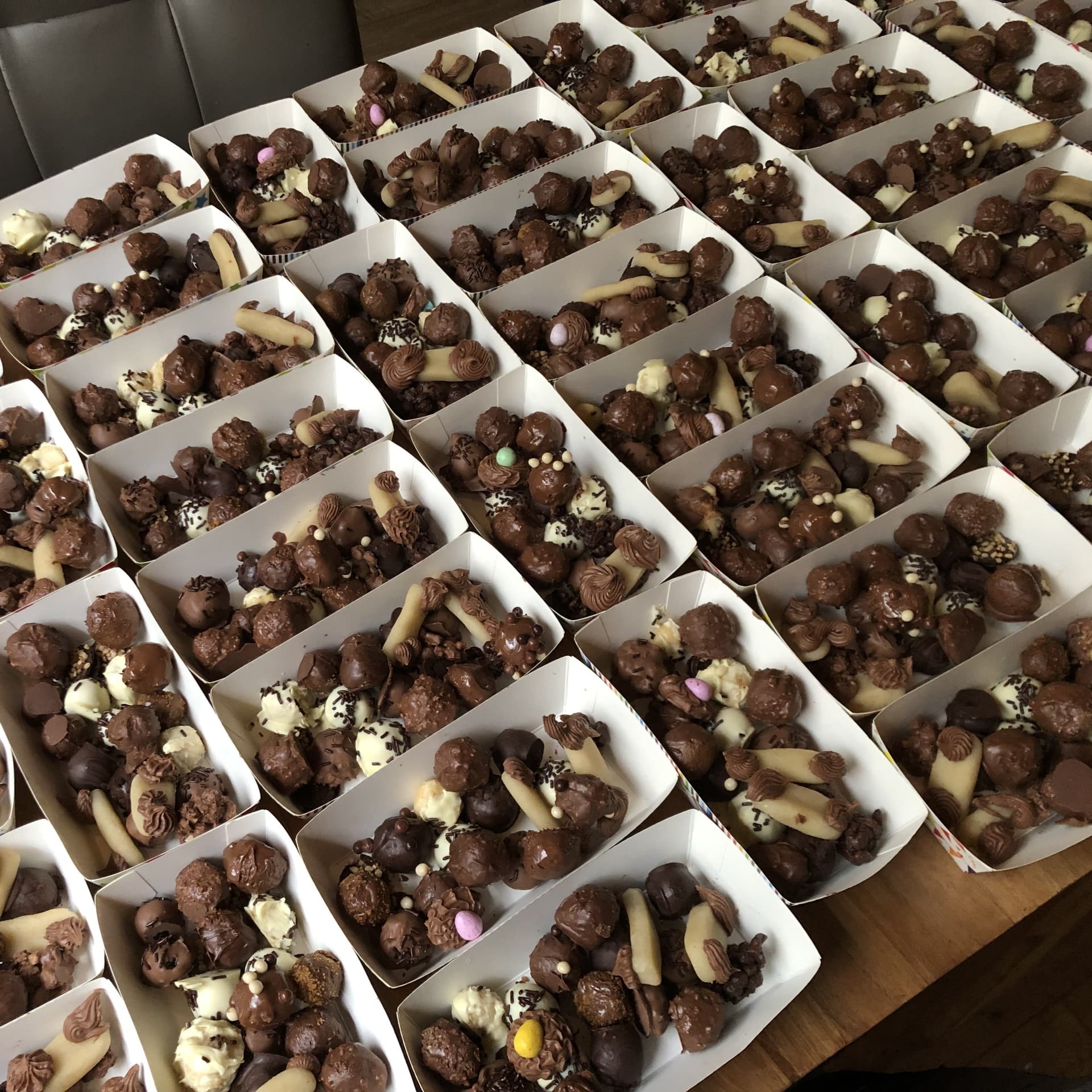 Als de chocolade staat uit te harden gaan we koekjestruffels maken. Iedere deelnemer krijgt een portie gemalen koek waarvan een deegje wordt gemaakt. Dit deegje wordt gevormd tot truffels en door de chocolade gehaald.