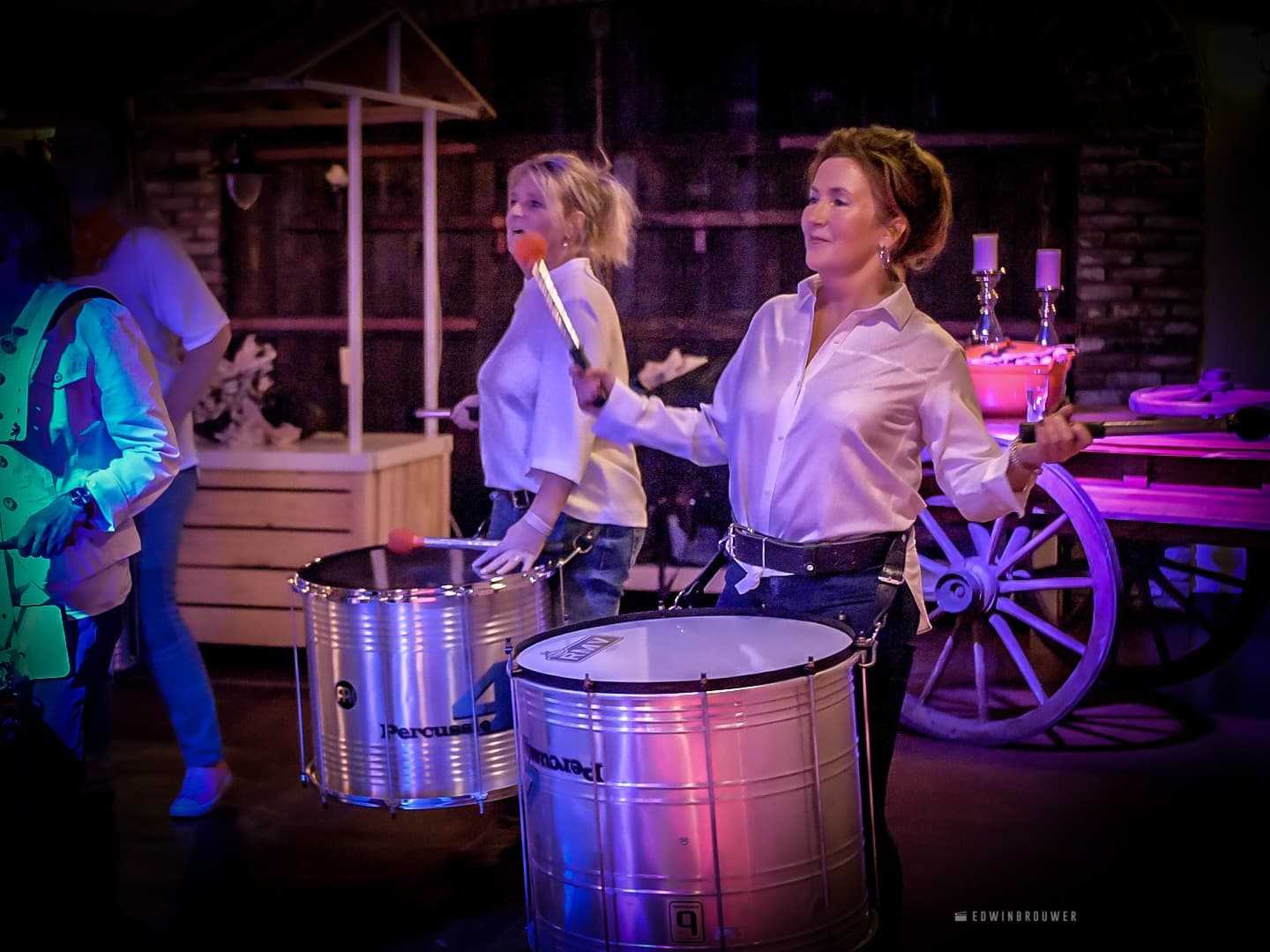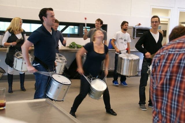 We laten zien dat je zonder drum of percussie ervaring samen een lekker Samba Batucada ritme kunt maken en spelen. We werken aan een intro een aantal gezamenlijke breaks, stops en een spectaculair eind. Aan het eind van de workshop doen we met iedereen de Braziliaanse trein, hiervoor moet je samenwerken en dien je naar elkaar te luisteren. De meest hilarische situaties ontstaan bij het vinden van de juiste timing om de trein te stoppen! Het is een samenspel waarbij iedereen nodig is in deze vorm van samba percussie spelen. Samenwerken maar voorop staat
