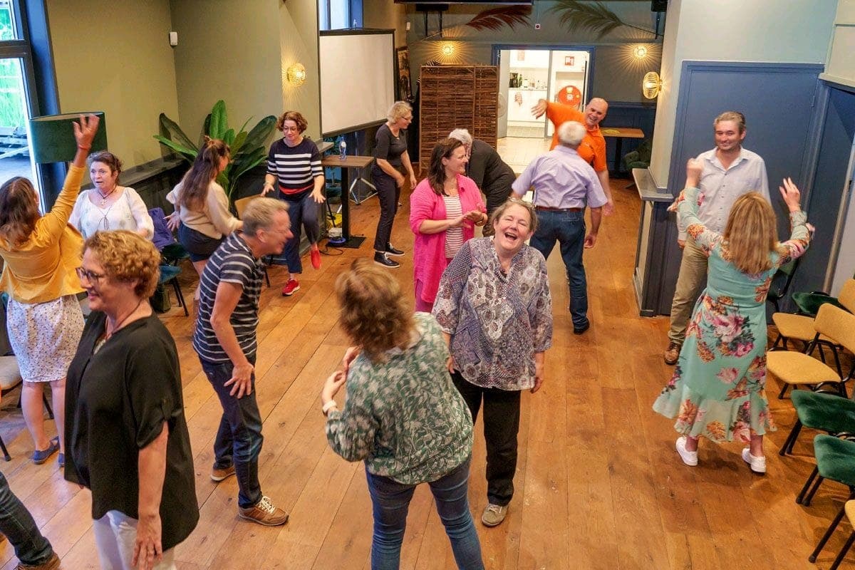 We starten rustig zodat mensen kunnen wennen aan de lach. De eerste giechels klinken vaak al tijdens de ‘warming-up’. Lachen werkt aanstekelijk dus we staan allemaal in een kring zodat iedereen elkaar goed kan zien.